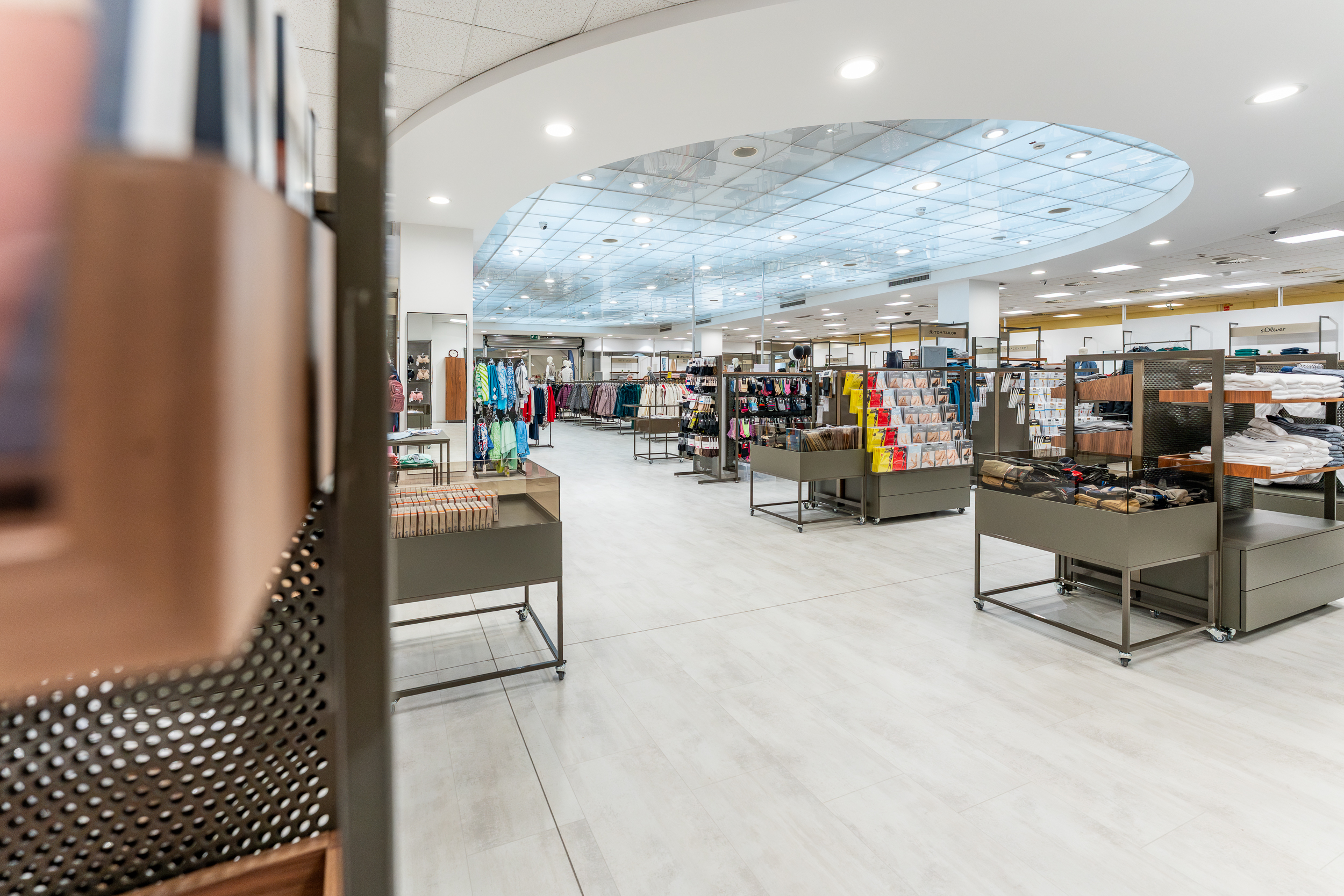 Uporabljen laminat se v takšnem okolju izkaže kot kakovostna in praktična rešitev, saj brez težav prenaša obremenitve, ki so značilne za trgovske prostore. Obenem s svojo umirjeno teksturo ne prevlada nad interierjem, temveč ga dopolnuje.